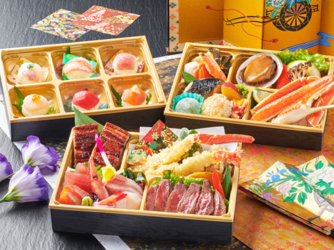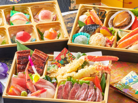 お刺身の5点盛、海老とカニ、野菜の天ぷら盛り合わせ、国産牛ステーキ、アワビのバター焼き、ボイルカニやうなぎなどとても贅沢なおかずに手まり寿司もついた3段重です。心もおなかも目一杯満たされてください。