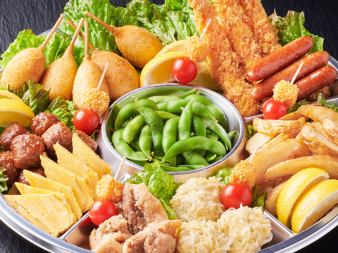 エビフライ・アメリカンドッグ・ウィンナー・唐揚げ・肉団子・ポテトフライ・手作りエビシュウマイ・カリカリチーズ・枝豆・プチトマト・自家製玉子焼