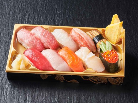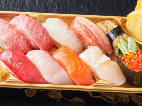 寿司10貫(中とろ2貫・赤身・かんぱち・鯛・サーモン・帆立・穴子・かに・いくら)・自家製玉子焼