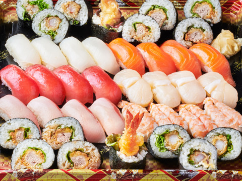 オーソドックスなネタを集めた定番の握り寿司に海老天巻きとヒレカツ巻きを2本づつ入れた豪華版。いろいろな席でご利用いただける定番握り寿司、巻物寿司の盛り合わせです。
