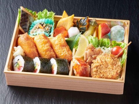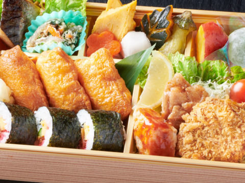 助六寿司・自家製玉子焼・豚肉と玉葱の串揚げ・サラダ・唐揚げ・季節の炊き合わせ・さば柚庵焼・豆腐ハンバーグ・こんにゃくの白和え・さつまいも甘露煮・和菓子